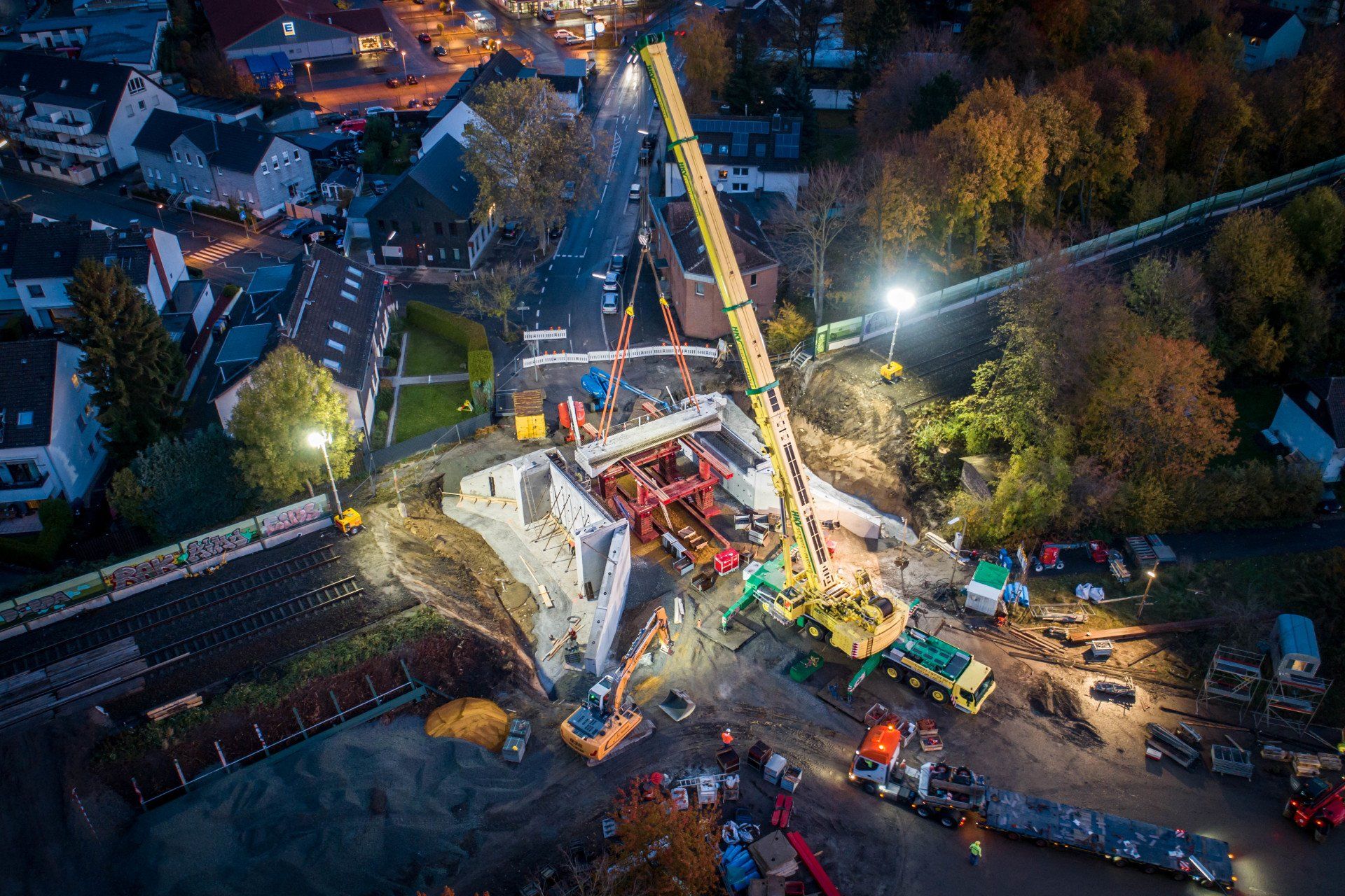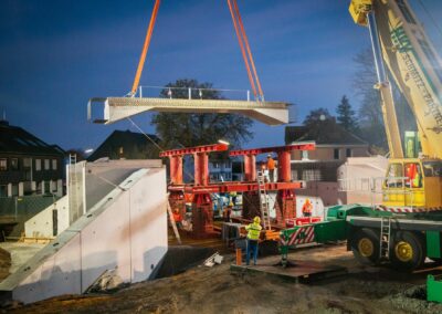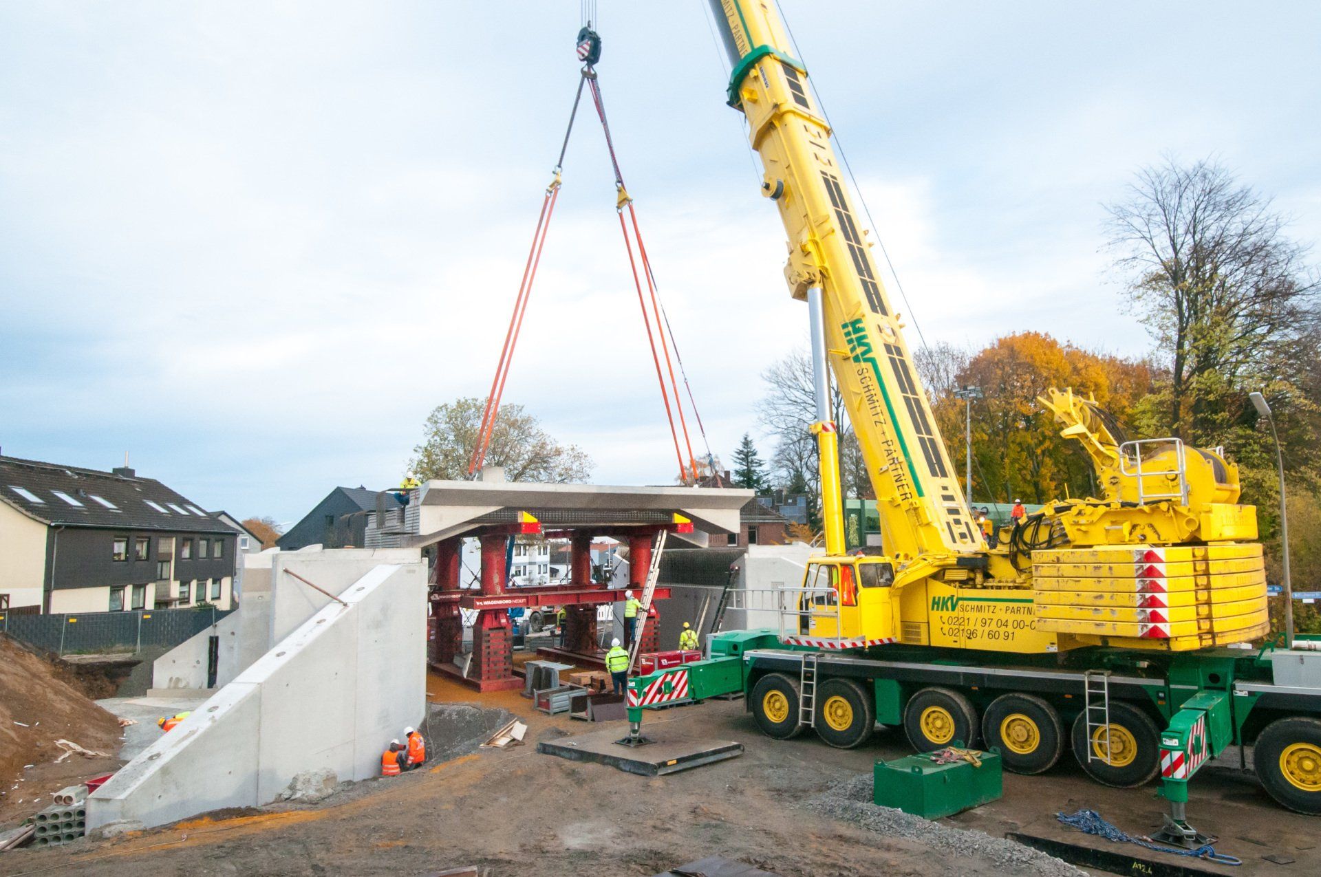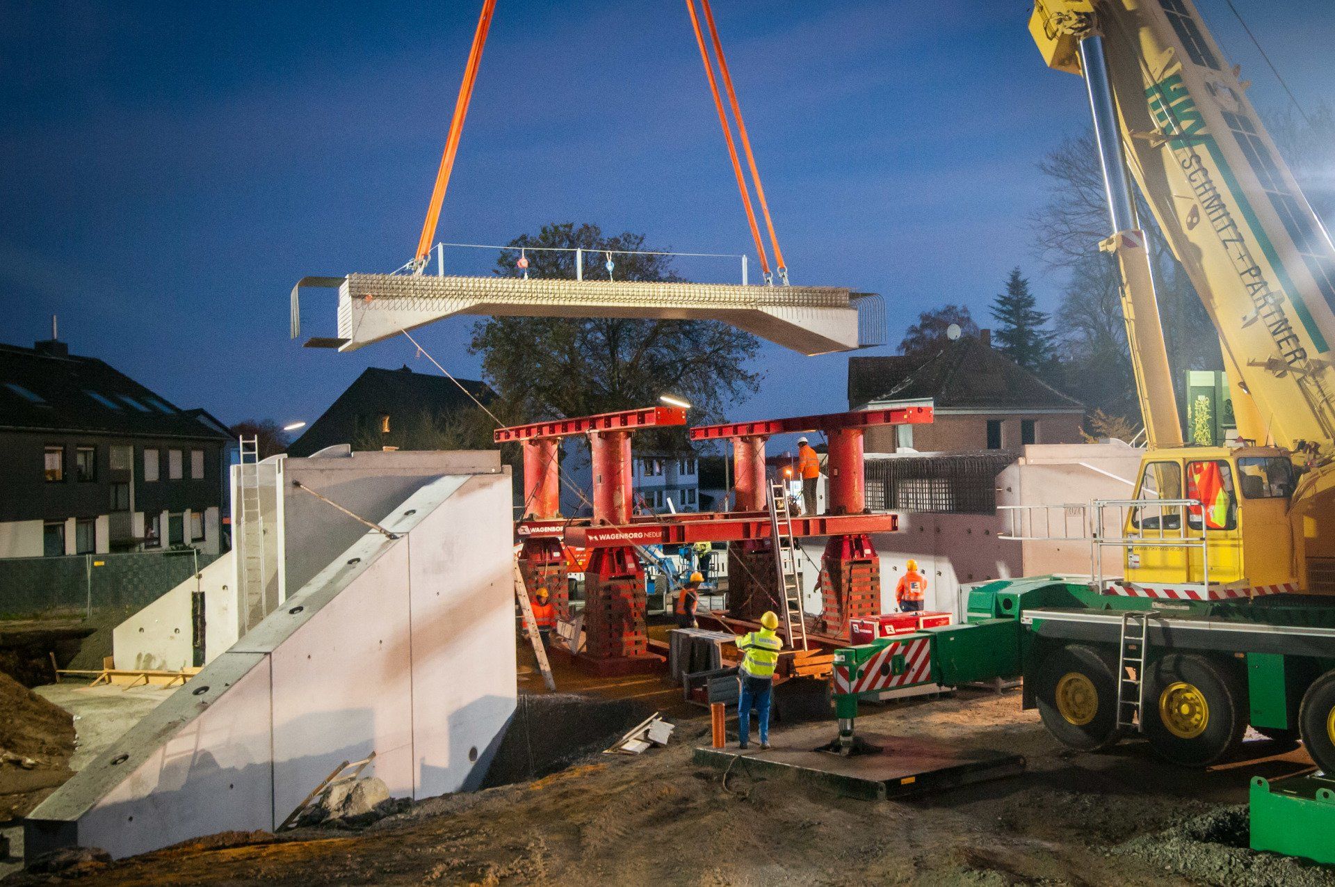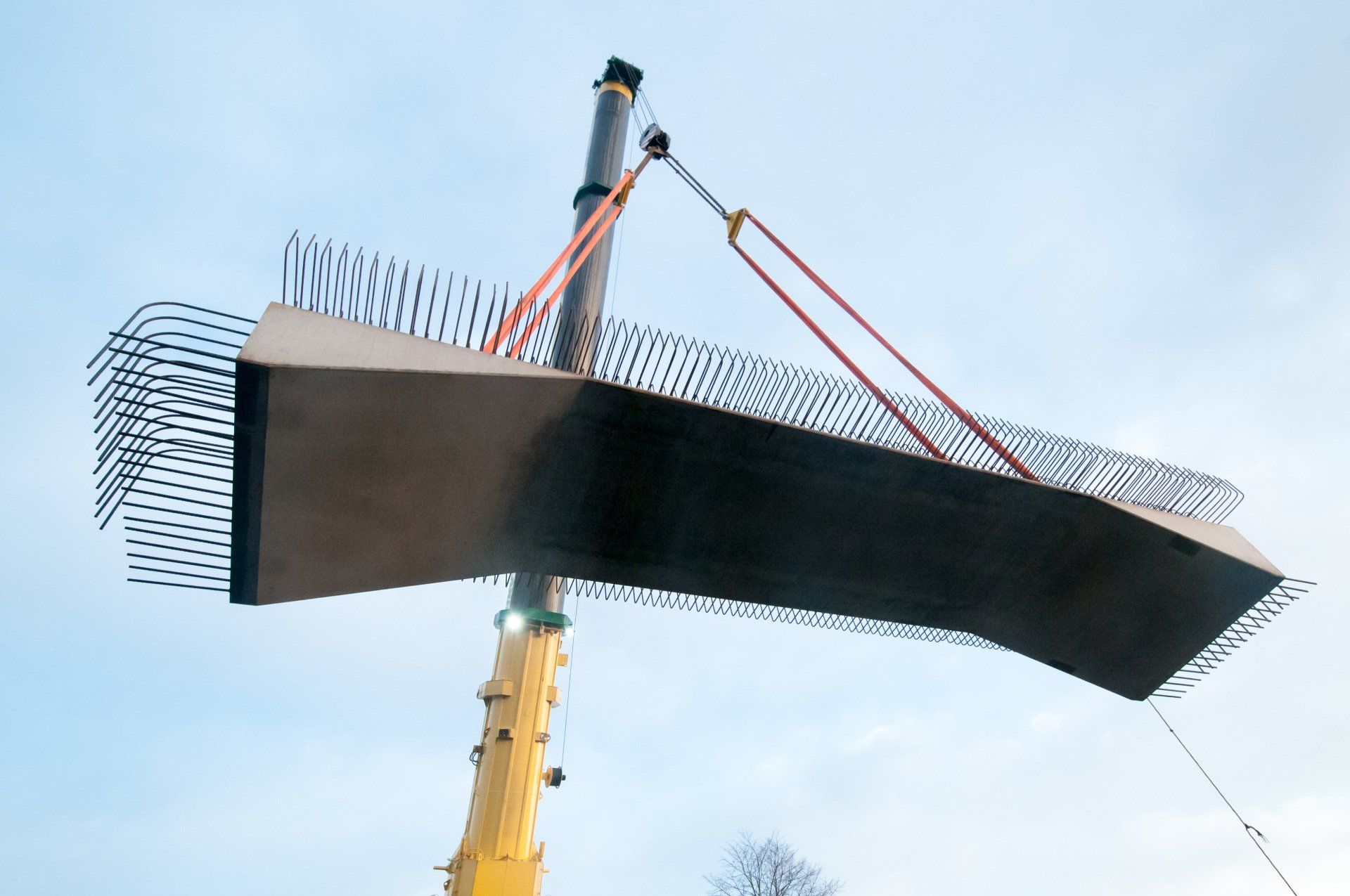 Im Zuge des Neubaus wird die Fahrbahn unter der Brücke verbreitert. Aus diesem Grund war die Spannweite der Brücke vergrößert worden, was auch die Benton-Teile an ein Gewicht von bis zu 51 Tonnen brachte.