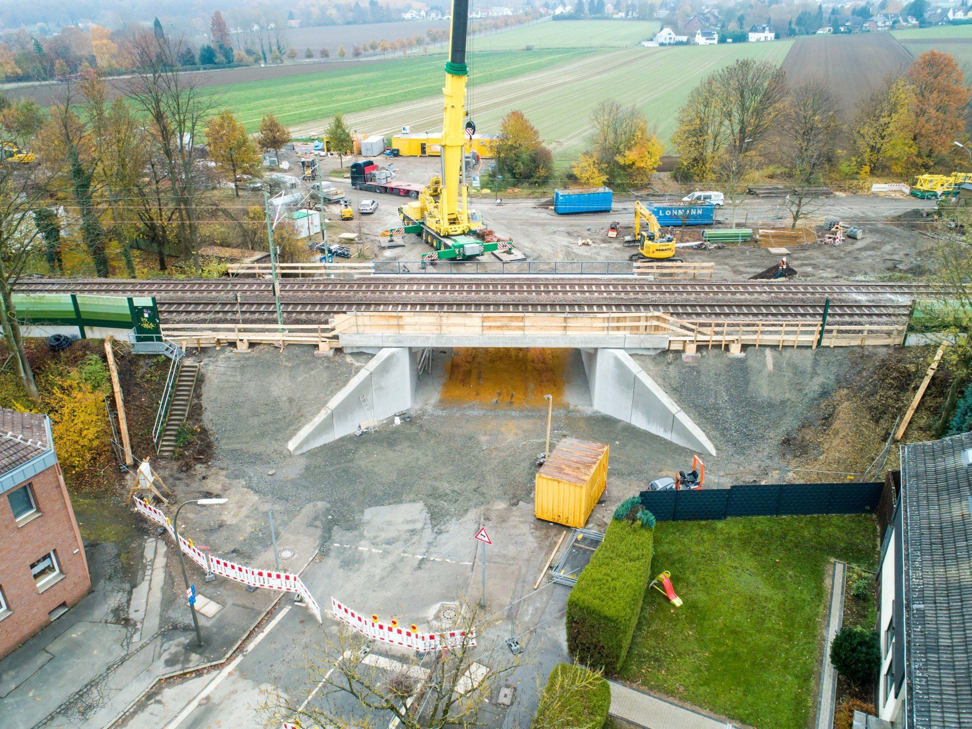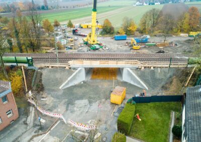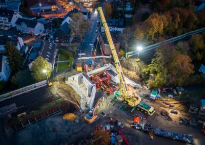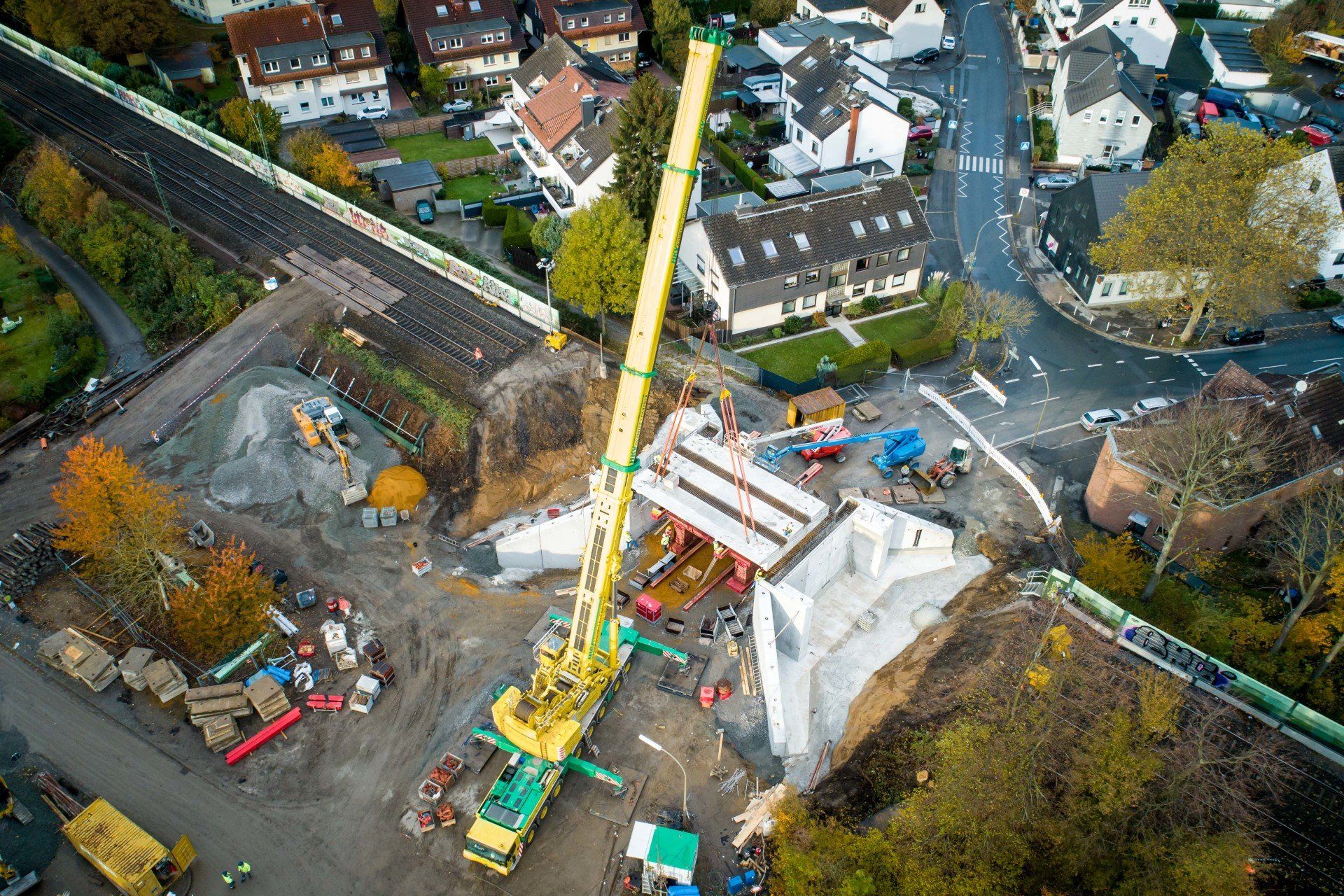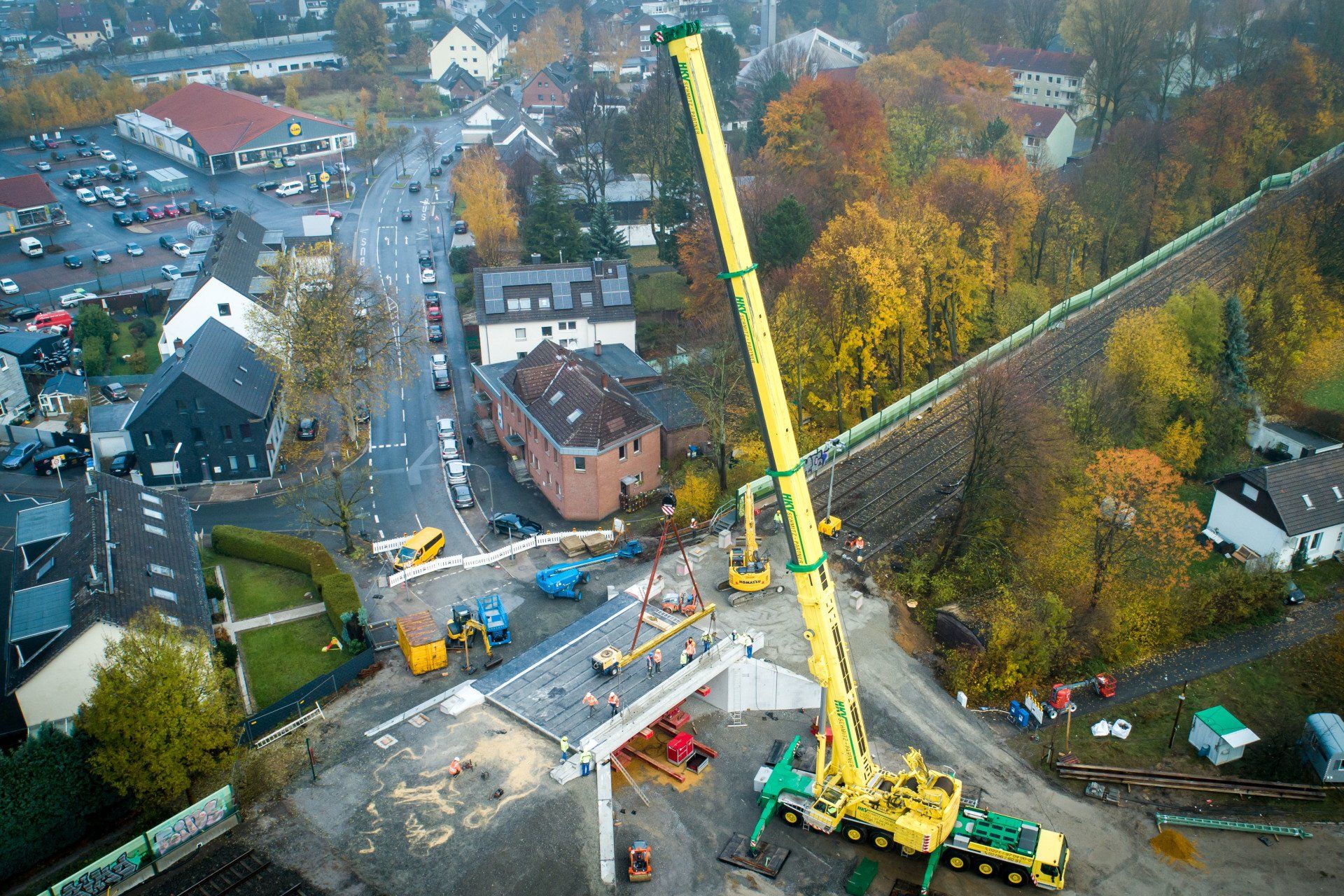 Im Zuge des Neubaus wird die Fahrbahn unter der Brücke verbreitert. Aus diesem Grund war die Spannweite der Brücke vergrößert worden, was auch die Benton-Teile an ein Gewicht von bis zu 51 Tonnen brachte.